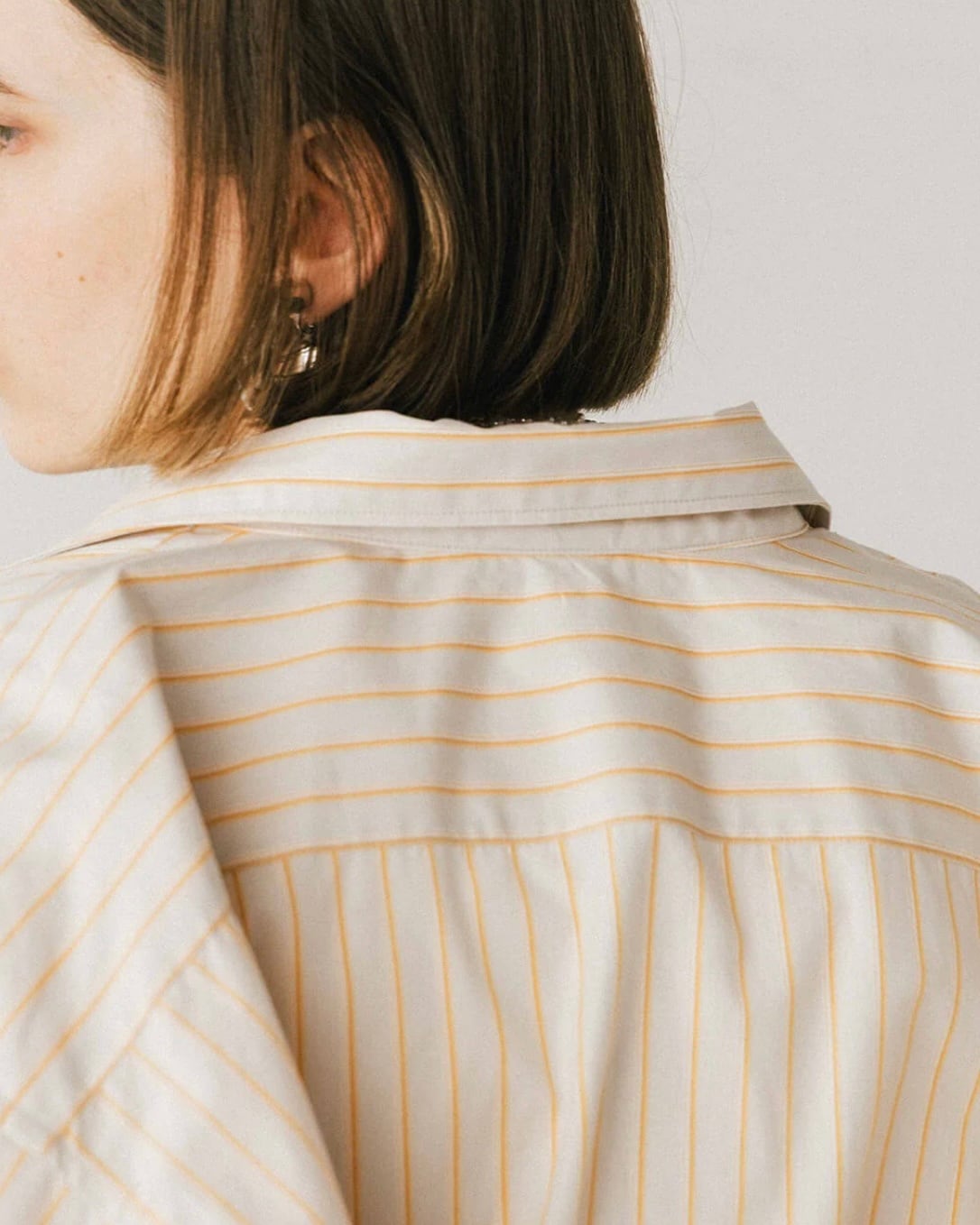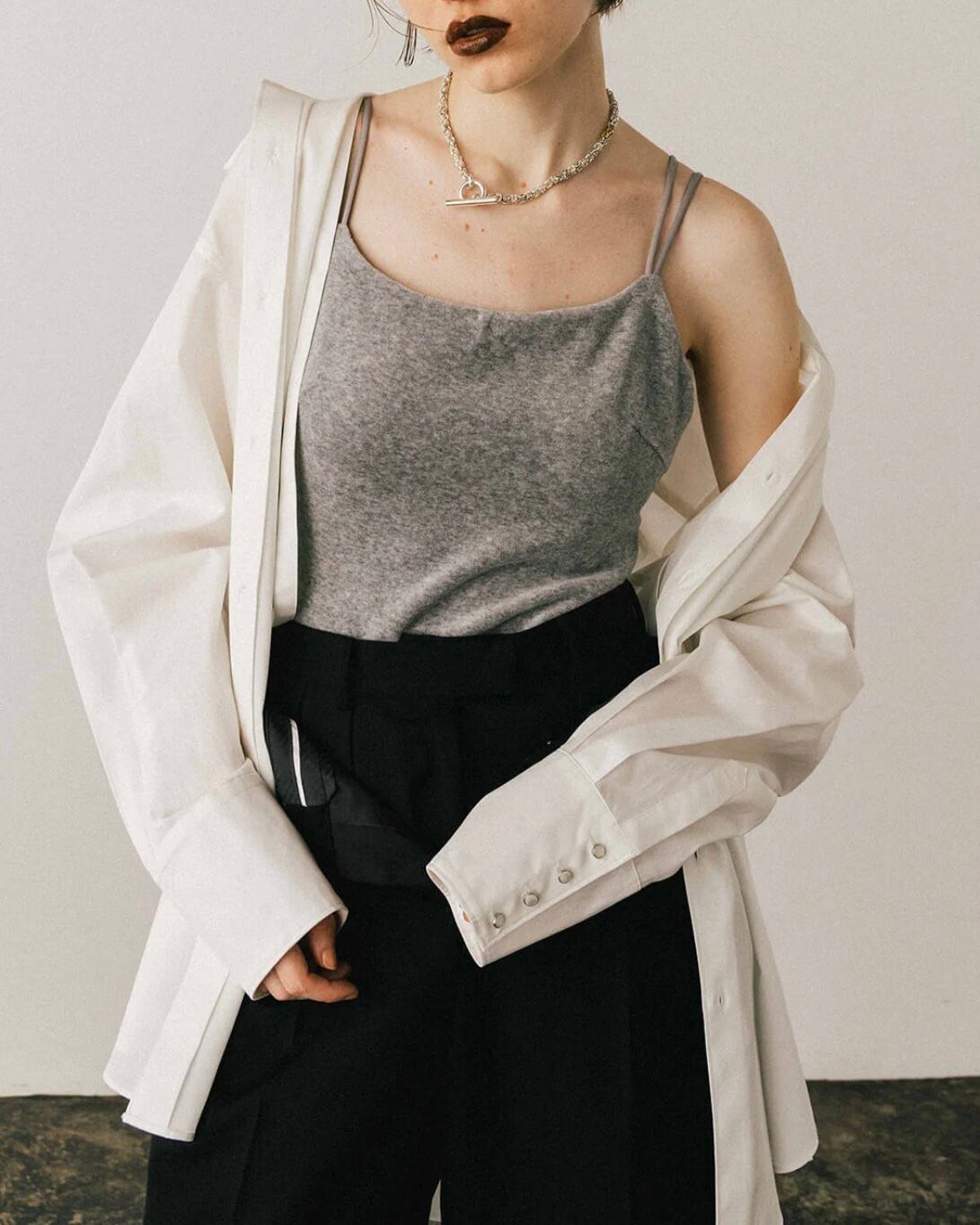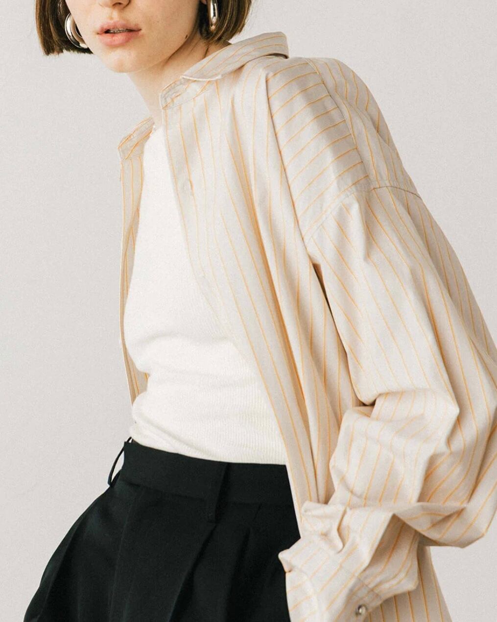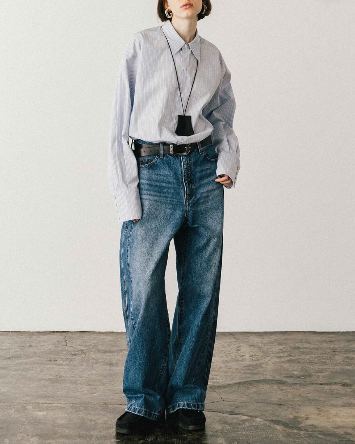 オーバーなサイズ感でありながらもメンズのシャツを着ているような、全てのパーツがオーバーなだらしない印象にはならない用に袖丈は調整。