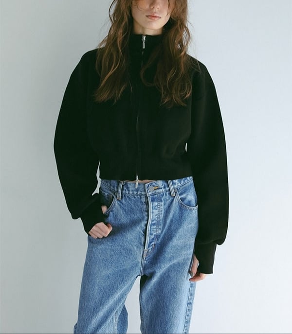 袖丈は長めの設定にし、袖口はサムホール仕様でコンパクトな着丈との絶妙なバランス感がモードな雰囲気をプラス。
