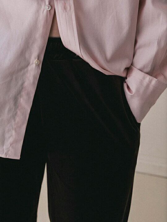 あえてストレートに落ちるトラウザーのパターンを踏襲し、ウエストはゴム仕様。
