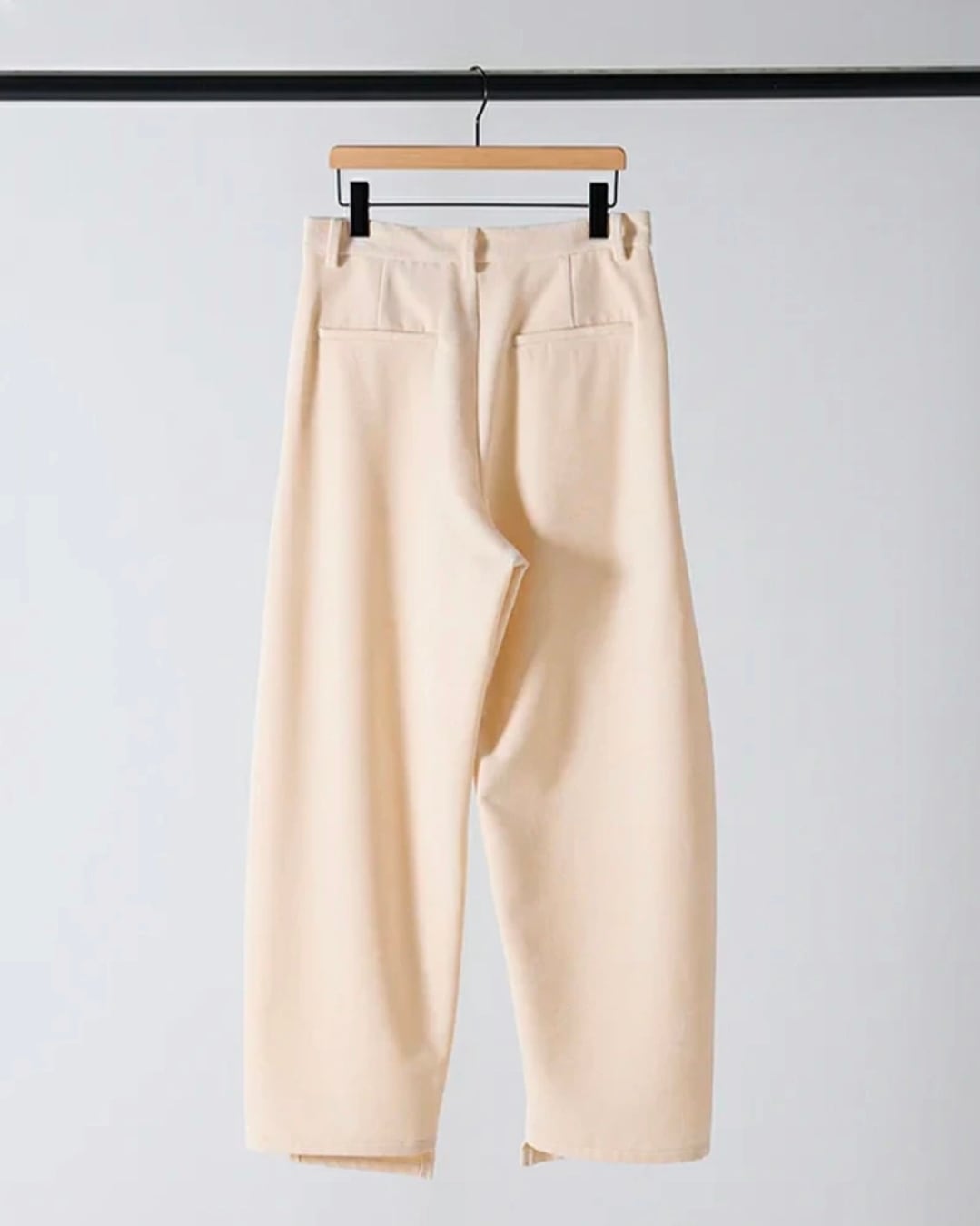 毛足のあるモール糸で織られたツイル生地を使用、なめらかな肌触りとベロアのような上品な光沢が特徴です。 脇の切り替えを利用した正面に向かってカーブを描くパターンになっていて、膝あたりで膨らむ自然なコクーンシルエットになるよう設計されています。 裾脇に入ったスリットは足の甲に乗って開くようにデザインされていて、パンツの裾を引きずらないように前は長く後は少し短めに設定しています。 しっかりとした暖かみのある素材で作るデザインパンツは機能性とデザイン性を備えた、寒い季節におすすめの1枚です。