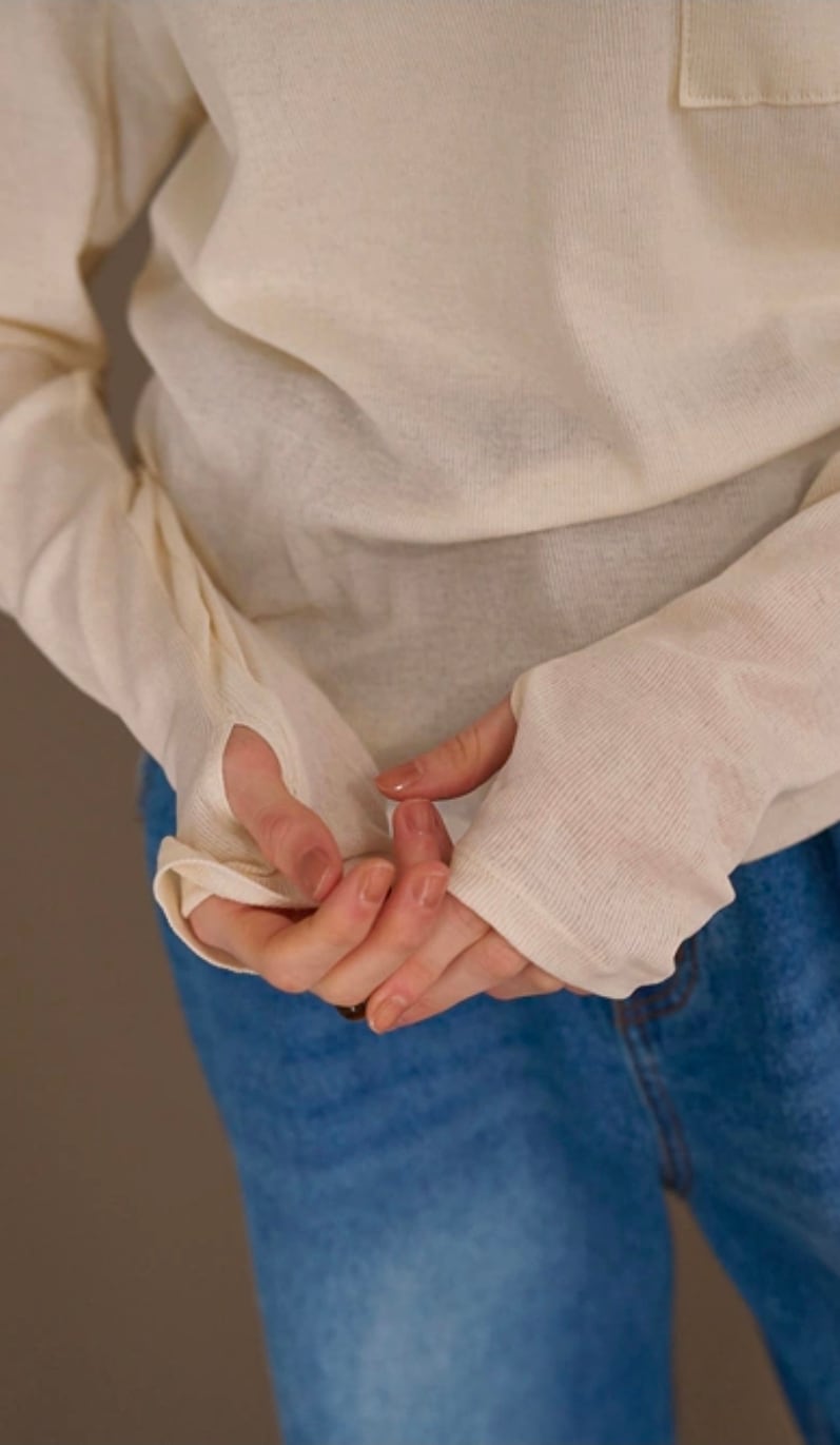 袖は長めに設定、袖口にかけては細めの作りになっていて、ゆるっと手首にたまるデザインにしています。