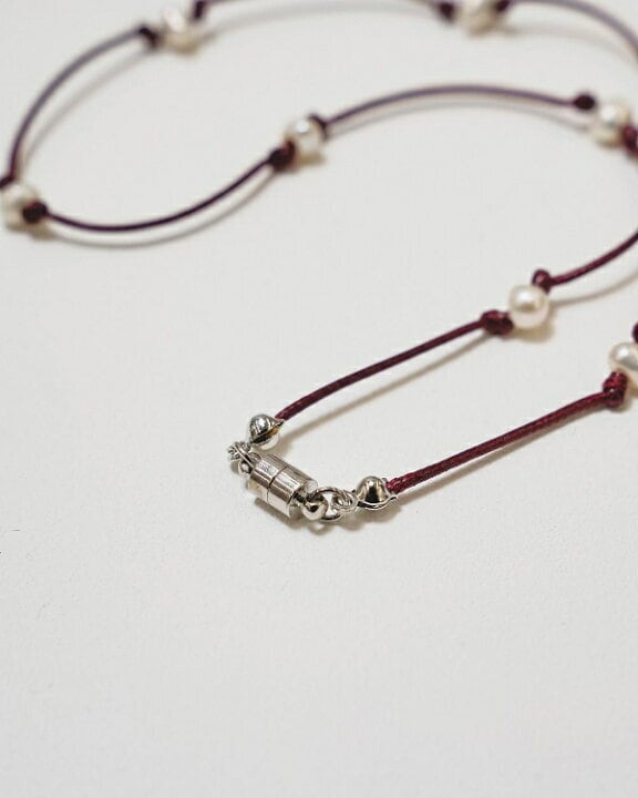 一つ一つ異なる形の淡水パールとコードの組み合わせが、シンプルでありながらも洗練された印象を与えます。