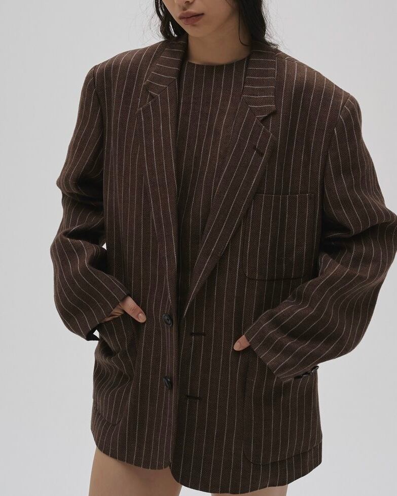 上質なリネン100%生地を使用し、オリジナルのストライプ柄で仕上げたジャケット。自然な張りや艶感、奥行きのある色味が表情豊かに映える一枚です。TODAYFULらしいオーバーサイズのシルエットで仕上げ、マニッシュなムードを漂わせながらもラフに羽織れるデザイン。同じ生地を使用したStripe Americansleeve Topsと合わせたセットアップスタイルもおすすめです。