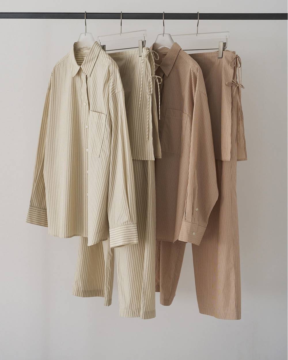 スタイリングのポイントになるストライプシャツ。オーバーなシルエットでラフに着ていただける一着。アイボリーはワントーン見えする3色の糸で織られたマルチストライプ。オレンジは2色のピンストライプに見えて、よく見ると細くもう1色ラインがあり、ほんのりと奥行きあるストライプになっています。ジャケットやコートの中にもさりげなく映えます。腰巻きしてコーディネートのアクセントとしてスタイリングしたり、同素材のStripe Layered Pantsとセットアップで着るのもおすすめです。