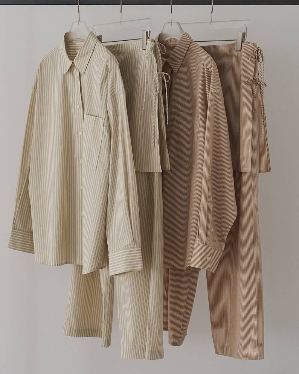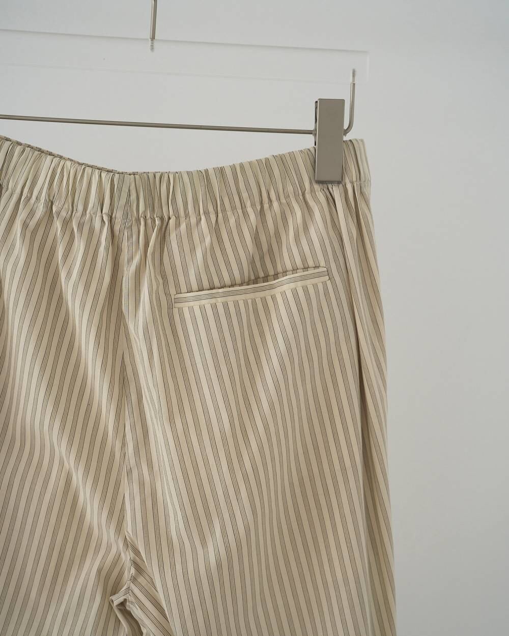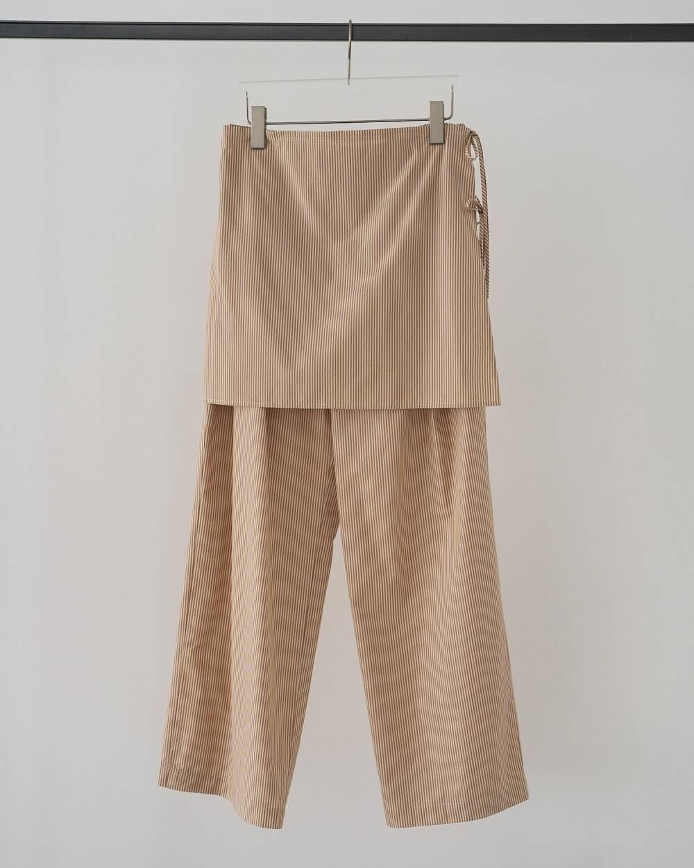 ストライプ柄のイージーパンツとラップスカートがセットになったレイヤードアイテム。動きのある柄使いが印象的な一着。パンツはタックが入ったストレートシルエットで後ろゴムで楽に履いていただけます。巻きスカートは、体に馴染むよう後ろにダーツを入れ、もたつかないように仕上げました。アイボリーはワントーン見えする3色の糸で織られたマルチストライプ。オレンジは2色のピンストライプに見えて、よく見ると細くもう1色ラインがあり、ほんのりと奥行きあるストライプになっています。同素材のStripe Over Shirtsとセットアップで着るのもおすすめ。ラップスカートは取り外し可能で、合わせるアイテムによって単品使いも可能です。