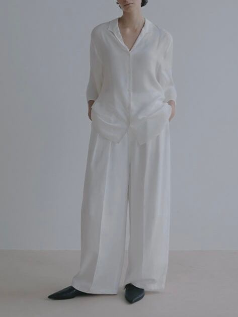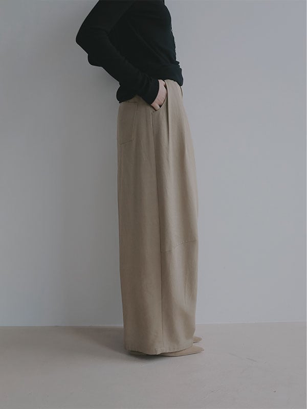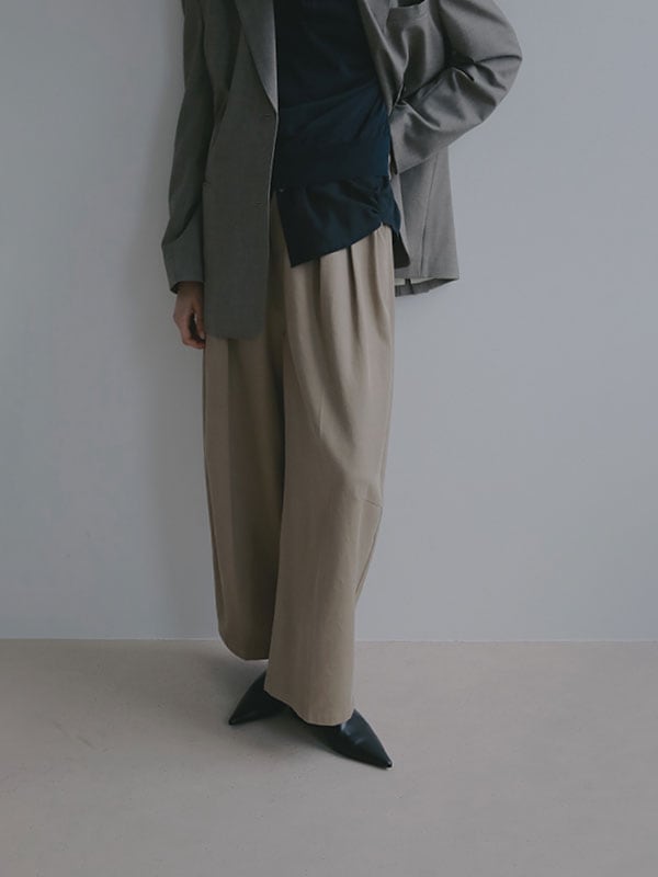 フロントには深めのタックを配し、腰まわりにほどよく余白を持たせながらも、サイドに沿う立体的なカーブラインが美しいシルエットを形成。